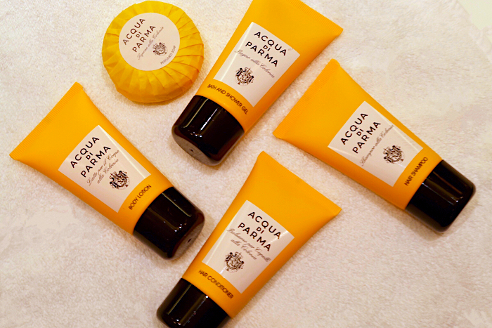 浴室的空间也分为专属的淋浴区和厕所。洗漱间均有双洗手盆,备品是帕尔玛之水系列。整个浴室的面积不小,在洗手盆上方的镜子里还隐藏了一个小电视,相比之下显得科技感十足。