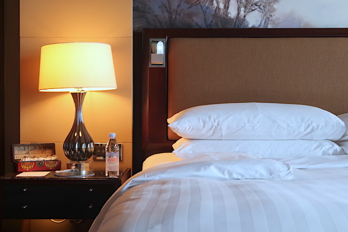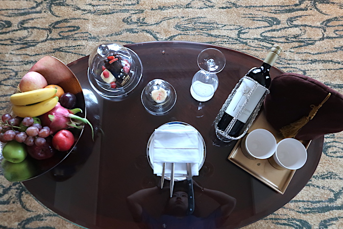 房间里的欢迎水果、甜品、红酒和茶水一应俱全,但从造型上少了些设计感和标志性的元素。夜床服务虽然完整,但相比其他酒店提供的甜食拼盘等,摆放的几瓶水稍显单调。