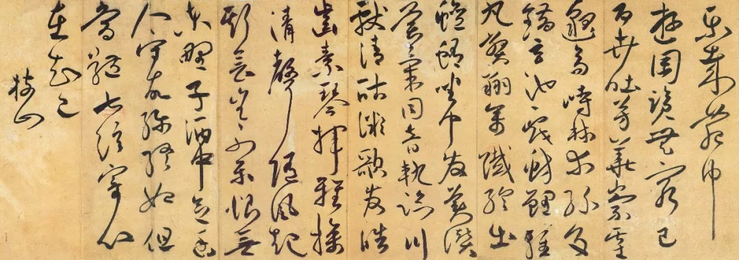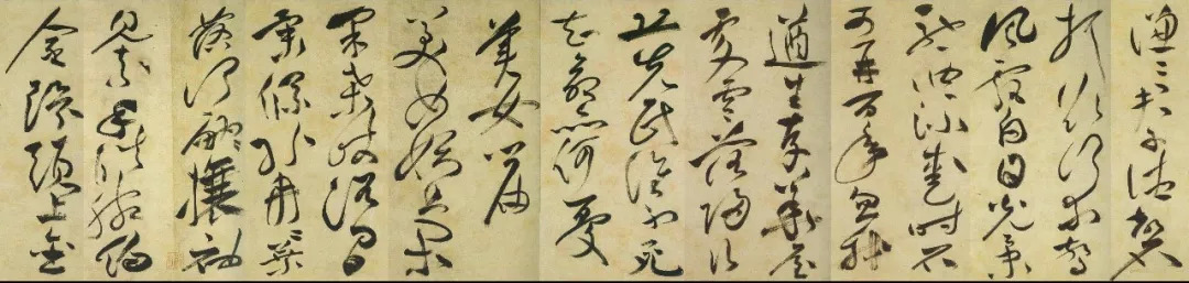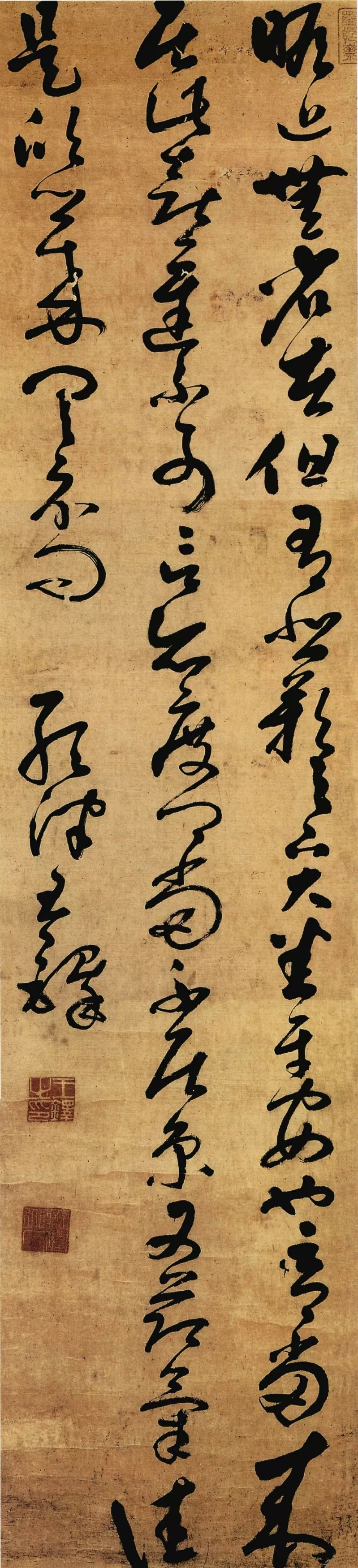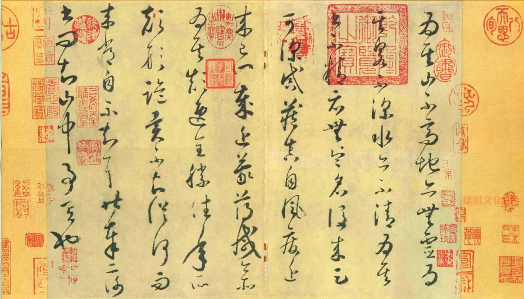 章法上注重通过字与字之间位置的移动形成新的组合,打破单字之间的界限,空间节奏变化强烈,黄庭坚在结构和章法上的匠心独运,使草书的字与字之间的连接不光可以靠上下连笔形成连贯,也可以通过断开的错位穿插形成连贯,开一代书坛新风。