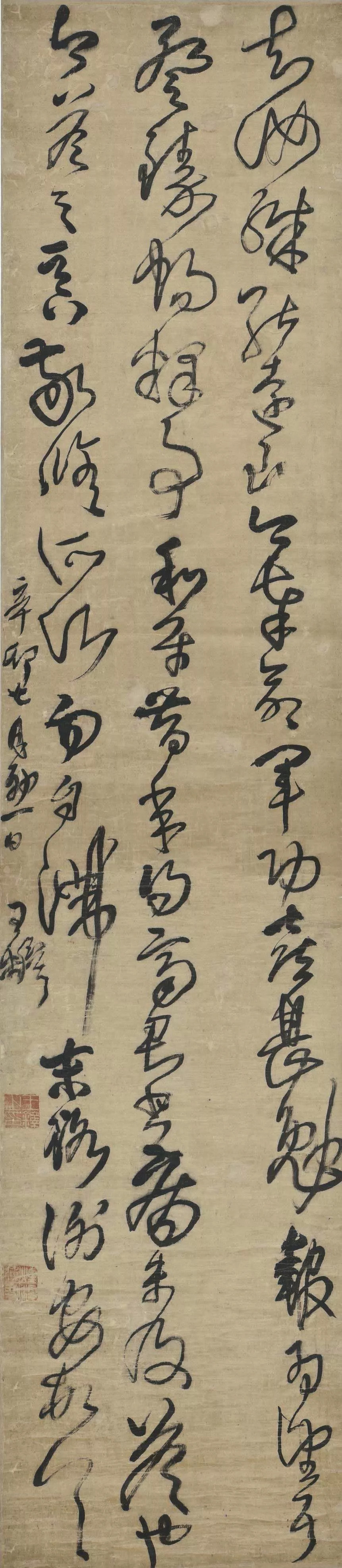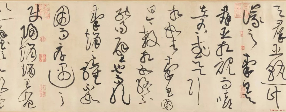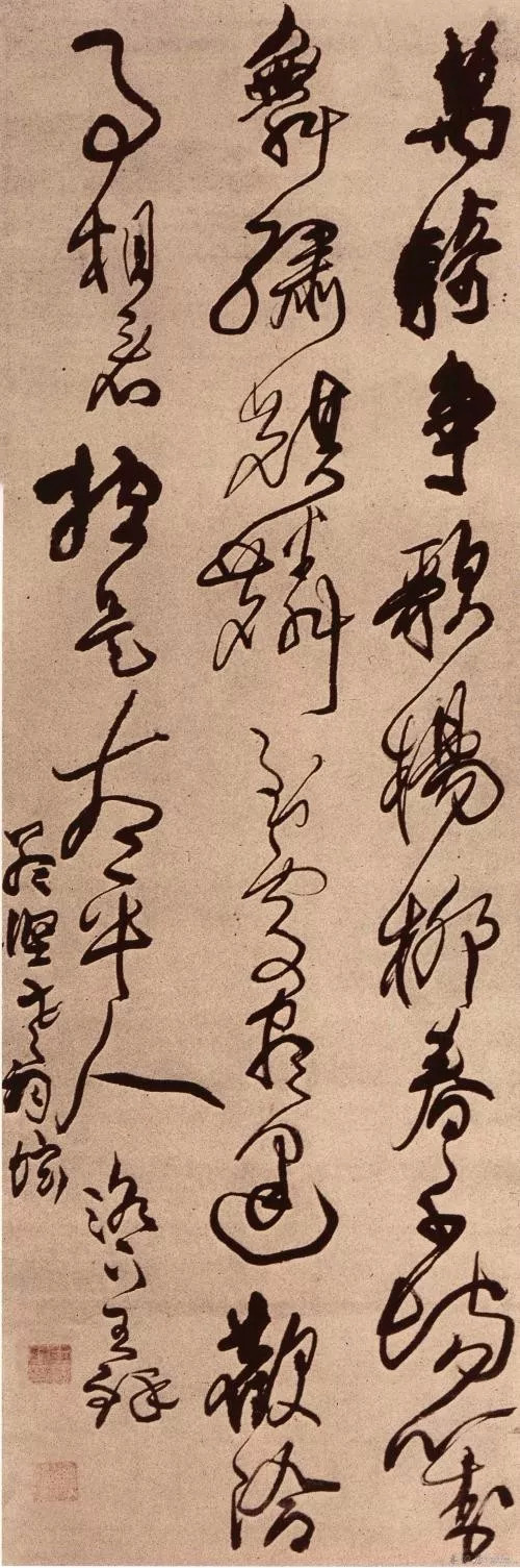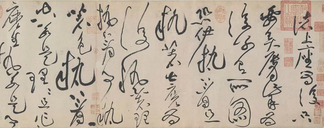 唐朝张怀瓘曾在《书断》中对张旭的草书有过生动的记载,“字之体势,一笔而成,偶有不连,而血脉不断,及其连者,气脉通其隔行”。欣赏张旭的草书总能被他不可遏止的创作激情所感染,草书的连绵体势在张旭的笔下幻化出无限的生命力,尽显豪逸超迈本色。