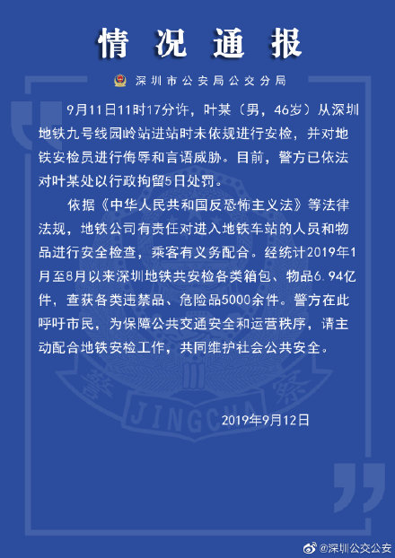 深圳市公安局公交分局通报,9月11日11时17分许,叶某(男,46岁)从深圳地铁九号线园岭站进站时未依规进行安检,并对地铁安检员进行侮辱和言语威胁。目前,警方已依法对叶某处以行政拘留5日的处罚。