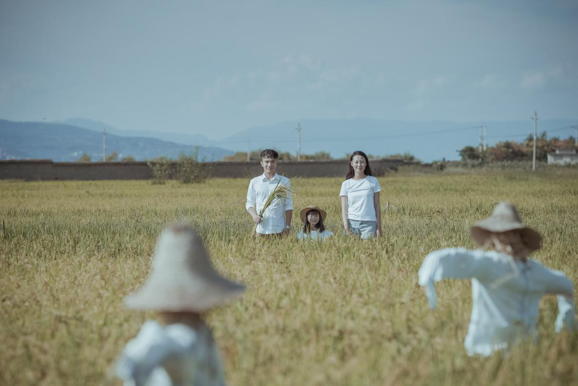 三口之家在抚仙湖畔抚仙谷稻田里合影实景图