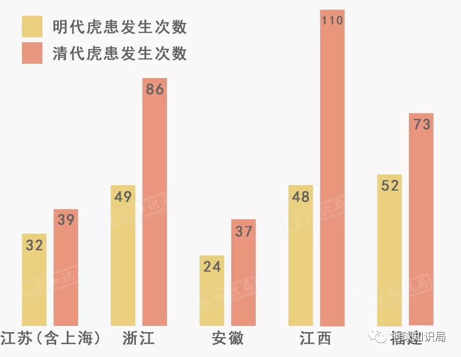 人地、虎地矛盾白热化的清朝,也是虎患最严重的时期。据统计,明清时期东南地区(江)出现虎患514次,是前一千年该地区发生虎患次数的85倍;明朝之前,虎患只出现在浙江杭州、萧山,安徽祁门,福建福州等少数几个县市,到了清朝之后已经几乎遍及东南各省众多县;在清代东南地区的349个州县中,有虎患发生的占到了56%。