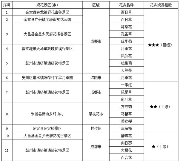 成都市金堂县转龙镇鲜花山谷景区的百日草、金堂县广兴镇宝塔山樱花公园的百日草、大邑县金星乡天府花溪谷景区的海棠花、都江堰市天马镇玫瑰花溪谷景区的月季花、彭州市通济镇通济花海景区的凤仙花、绵阳市安州区塔水镇浮萍村宇承月季园的月季花、攀枝花市米易县新山乡坪山村的万寿菊、甘孜州泸定县泸定桥景区的三角梅。