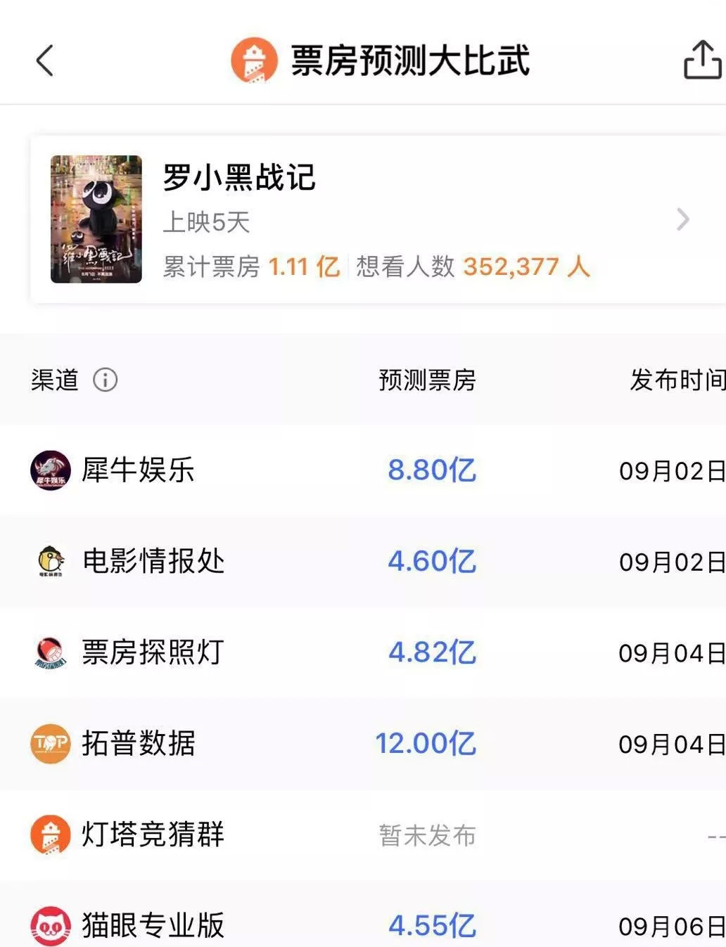 基于此,外界关于《罗小黑战记》票房的“预测”迅速提升。“预测票房”向来是中国电影市场的一个“标志”,无论是最开始的自媒体人工预测还是后来票务平台的大数据,预测票房都成为了整个市场对于电影预判的一个风向标。