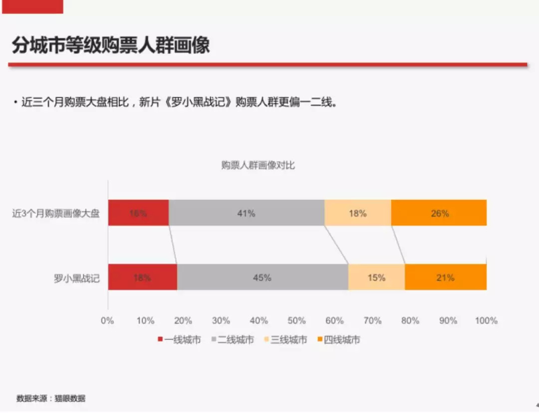 由于动画消费本身还不具备常态化的优势,那么非电视时代崛起的动画IP往往依赖一二线城市的受众。从《罗小黑战记》的用户画像来看,其一二线城市的票房占比要高于《哪吒》。