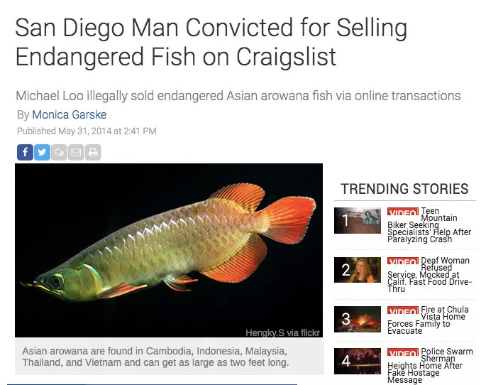 1980年,龙鱼登上了华盛顿公约的濒危动物名单,在美国属于禁止进口的鱼类。不过可以在黑市上交易,有的人为了龙鱼而进了监狱。