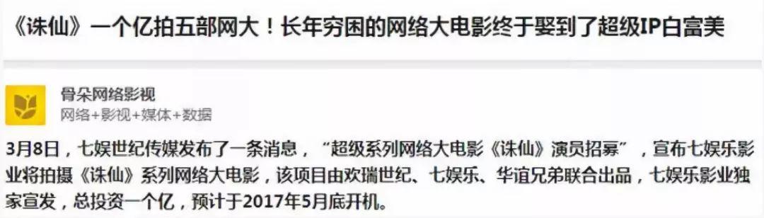 眼看《青云志》上下两部播完之后,《诛仙》影视化改编权还没来得及好好利用,还差四个月即将到期,欢瑞世纪“急中生智”,联合七娱乐、华谊兄弟,对外公布了《诛仙》的网络大电影拍摄计划,声称总投资1亿拍摄5部作品,单部投资2000万,于2017年5月底开机。