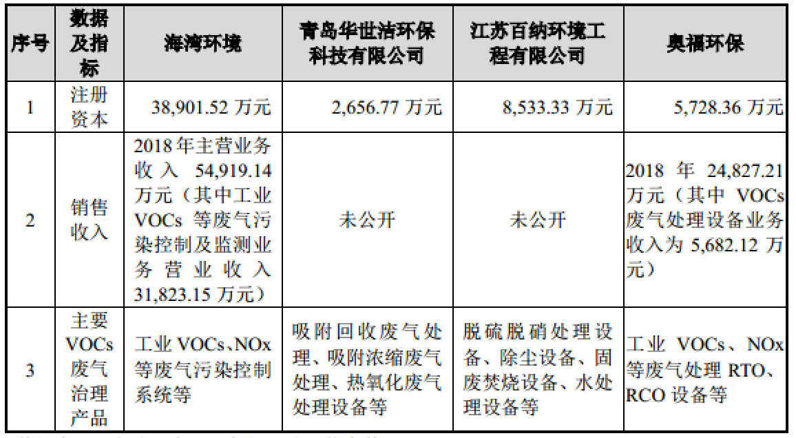 VOCs废气治理行业的竞争对手则包括海湾环境科技(北京)股份有限公司、青岛华世洁环保科技有限公司、江苏百纳环境工程有限公司等。