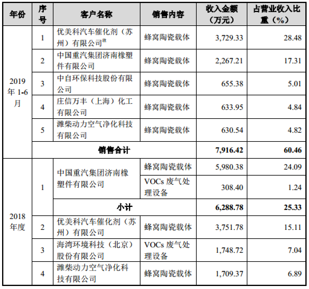 数据显示,2018年公司前五客户实现的销售收入占总营业收入的比例为61.14%,其中第一大客户中国重汽集团济南橡塑件有限公司(下称重汽济南)的占比就达25.33%。2019年上半年,奥福环保的前五客户收入占比同样为60.46%,优美科汽车催化剂(苏州)有限公司的占比高达28.48%,重汽济南居次,比例为17.31%。