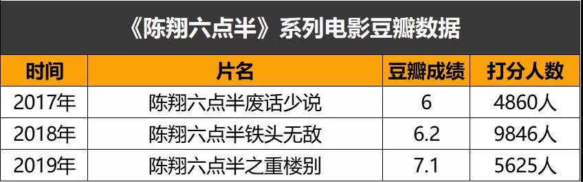 首部作品《陈翔连六点半之废话少说》2017年上线,150万的成本最终收获493万的分账;紧接着第二部作品《陈翔六点半之铁头无敌》于2018年上线,这一次片方升级了影片成本,最终上线2个月后分账金额达到1200多万。