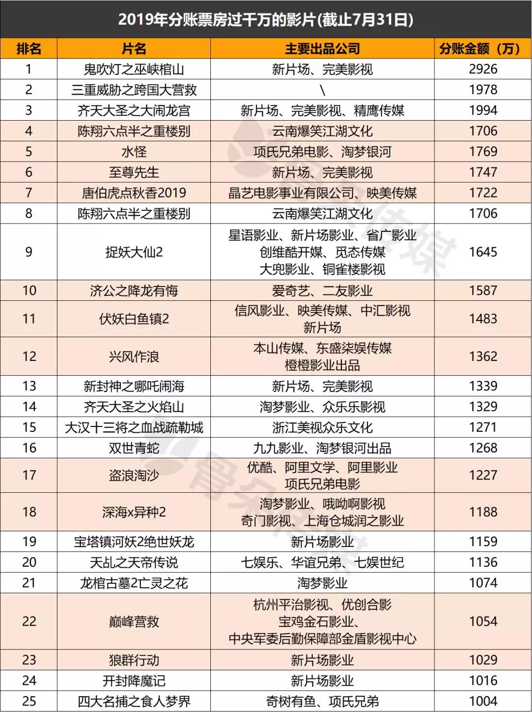 不过在上半年分账金额破千万的成绩单中,淘梦虽有5部进入,但成绩上取得最高分账金额的《水怪》也仅排名第5位,其他四部影片《齐天大圣之火焰山》《双世青蛇》《深海X异种2》《龙棺古墓2亡灵之花》排名都在十名开外。
