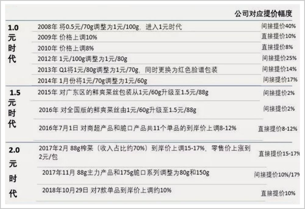 最终,涪陵榨菜主力产品的零售价格从0.5元提升至1元,每包克重从70g提升至100g。通过这种方式,涪陵榨菜间接提价约23%,正式步入1元时代。