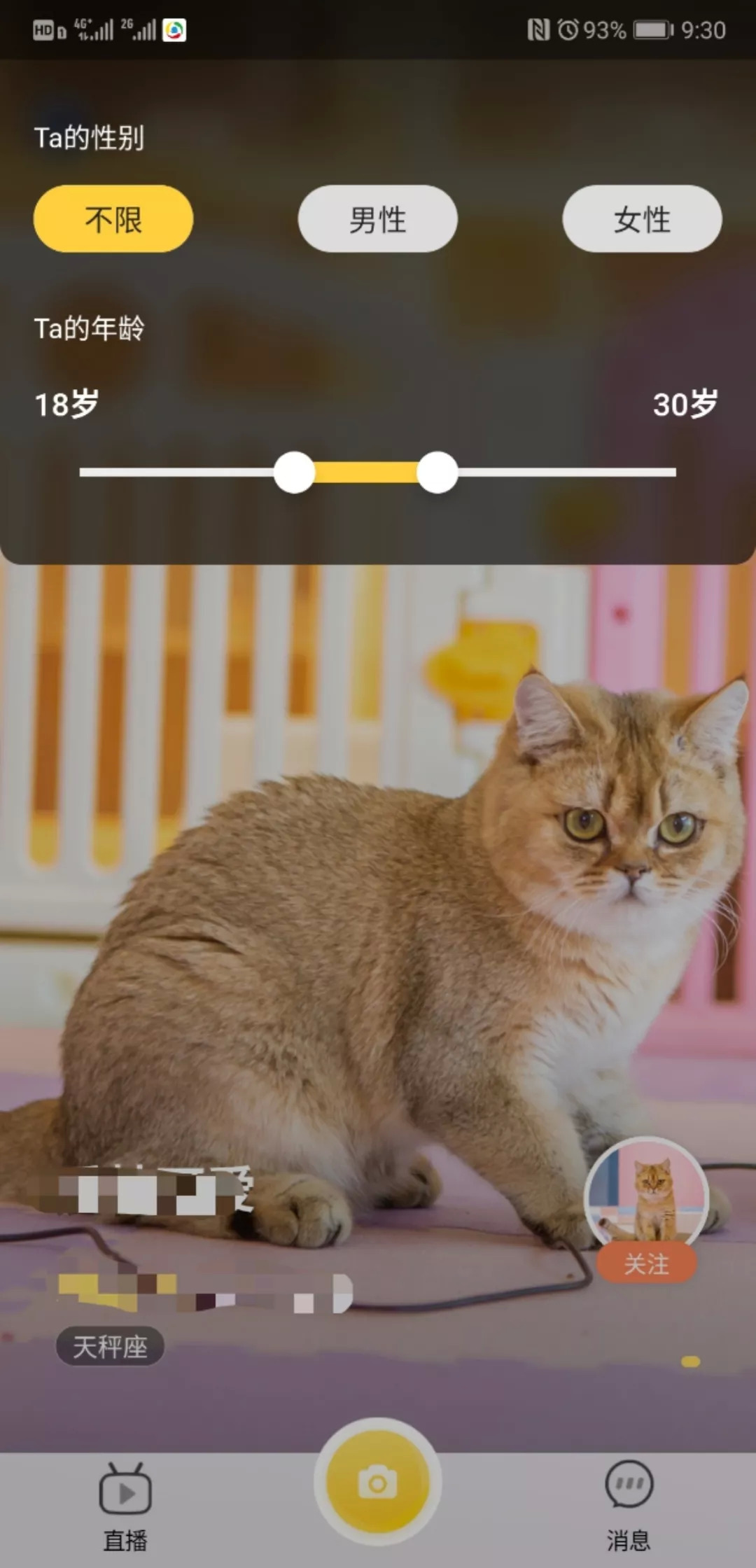 发现界面中则承载了陌生人社交的功能,每个用户都可以建立和发布自己的个人资料卡,同时选择感兴趣的用户,点击其性别和年龄区域查看对方详细资料,点击头像下方的关注后,就可以主动发起聊天。同时一米直播还支持自主筛选用户,上下滑动来查看其他用户。消息页面则可以查看打招呼信息、关注的人和私聊列表。