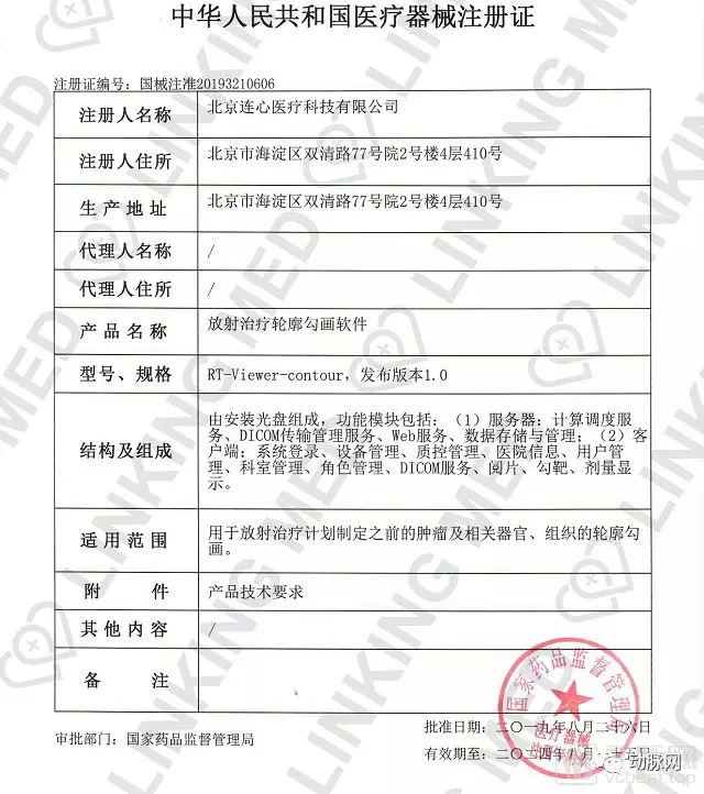 “连心医疗自主研发的智能云勾画系统AiContour已于8月底获得国家药品监督管理局(NMPA)三类医疗器械注册证。