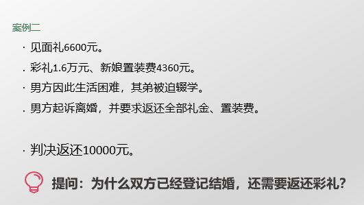 贾律师:对,彩礼问题和结婚时间的长短也有关系。像结婚十年的,就可能不会产生彩礼的返还问题了。一般彩礼问题都会集中在婚姻关系非常短,彩礼还没有消耗掉的时候。