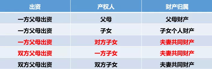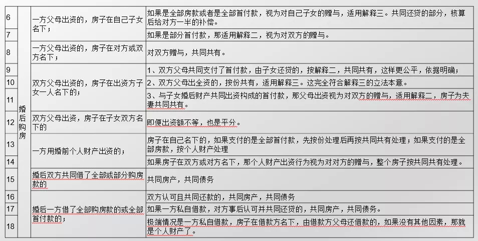这里我做了一个详细的针对房产的表,其中有婚后购房的情况,包括一方父母出资的房子在自己子女名下,还有一方父母全额出资/部分出资,以及婚后一方借款购房的情况。