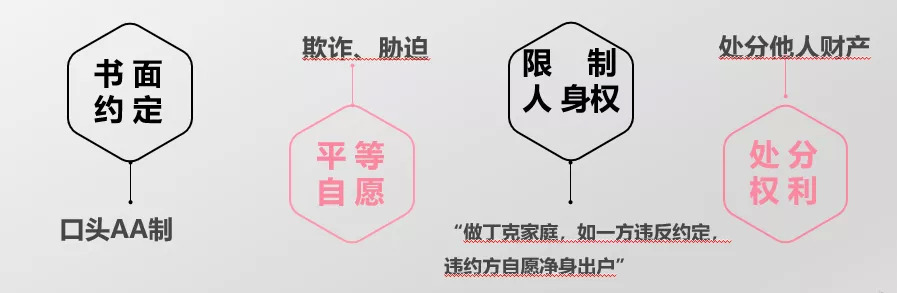 以上图表显示了做婚前协议时要避免的雷点,比如说有隐瞒、欺诈、胁迫的情况,这样的协议就会无效,存在限制人身权情况的也会导致协议无效。