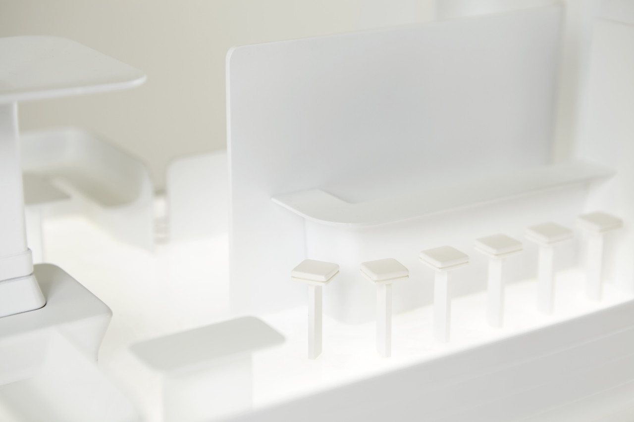 领土工作室在英格兰的松林制片厂为客舱内部设计建造了一个1:1比例的模型,并邀请演员们进入客舱进行体验。在身上几处关键部位配有感应器的演员在建筑模型中来回走动,向大家展示现实生活中的乘客们可以如何使用飞机内部空间。领土工作室将其行为录制下来,并渲染成为3D素描版。