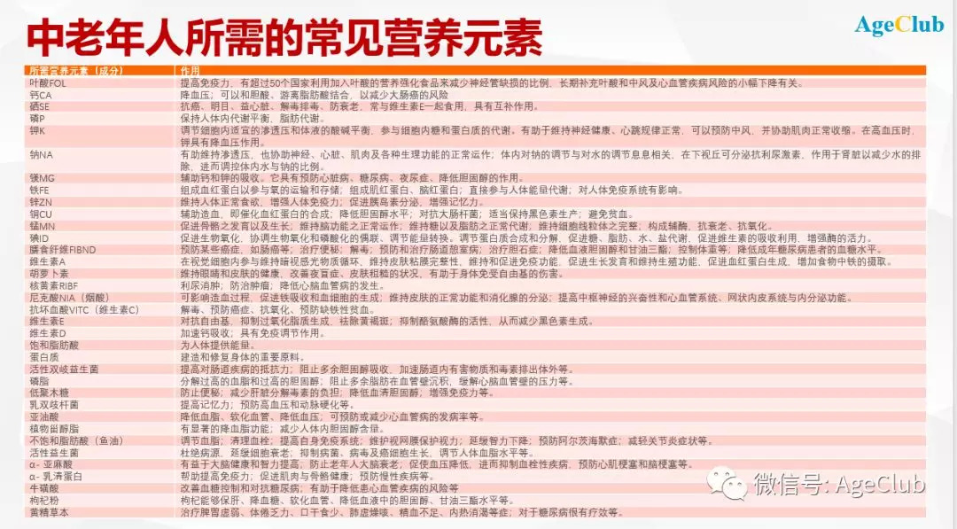 下面列出了中老年人群对营养元素的需求,这些需求对中老年人的健康来说其实是非常刚性的,而相应的配方技术其实在婴幼儿奶粉行业都已经很成熟了。