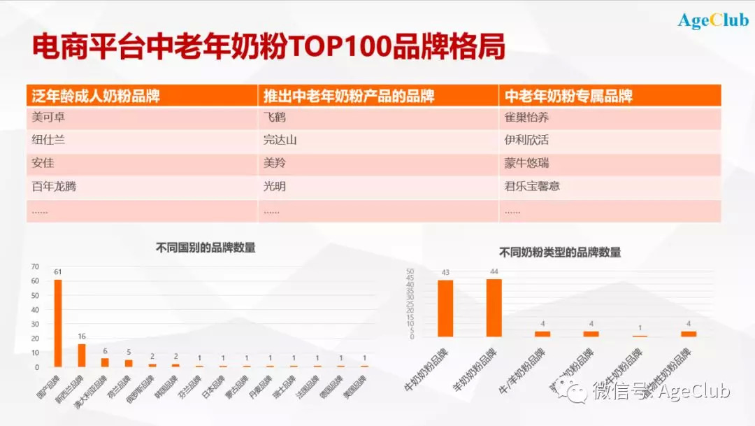 目前中老年市场并未得到国内奶粉企业的足够重视。在AgeClub近期统计的5000多条中老年奶粉电商数据中,共覆盖321个品牌,总销售额约为9977万元,但专门为中老年人推出的奶粉品牌仅有雀巢怡养、伊利欣活、蒙牛悠瑞等少数几个。