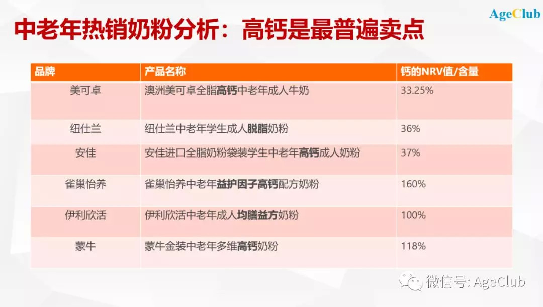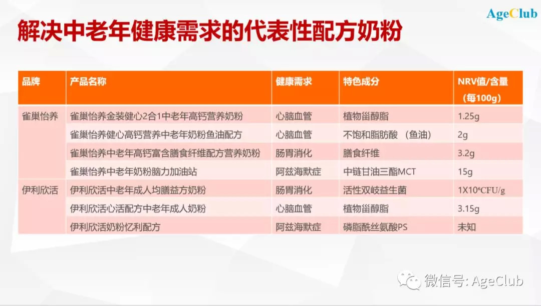前文分析过,高钙是国内中老年奶粉的主要卖点,同时雀巢、伊利等品牌已经针对心脑血管、肠胃消化、阿兹海默症等推出专门的奶粉产品。