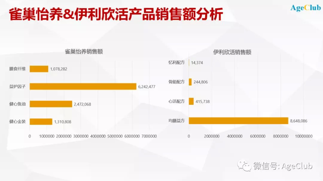 从本次统计的数据看,雀巢怡养的益护因子和伊利欣活的均膳益方两款产品卖得最好,销售额分别达到624万元和865万元。
