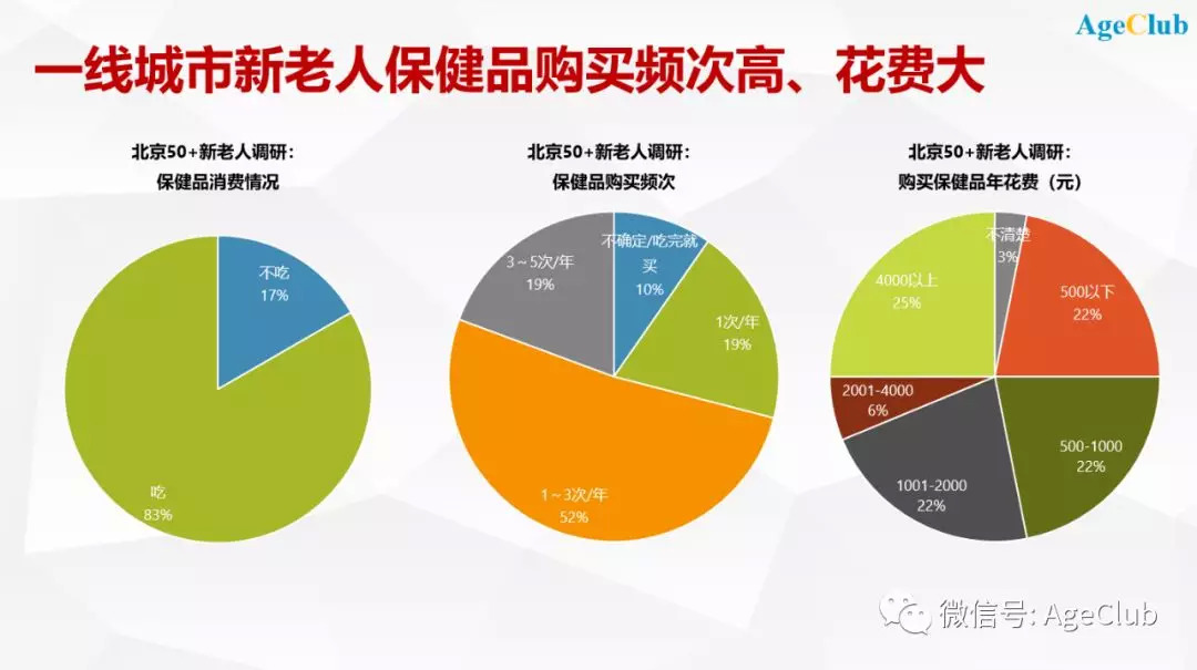 这在近期AgeClub对北京50+新老人所做的深度调研中体现得非常明显。受访者中83%有吃保健品的习惯,每年至少购买1次保健品的占比达90%,有19%的人每年会购买3-5次。在年花费上,1000元以上的占比达53%,4000元以上的也有25%。