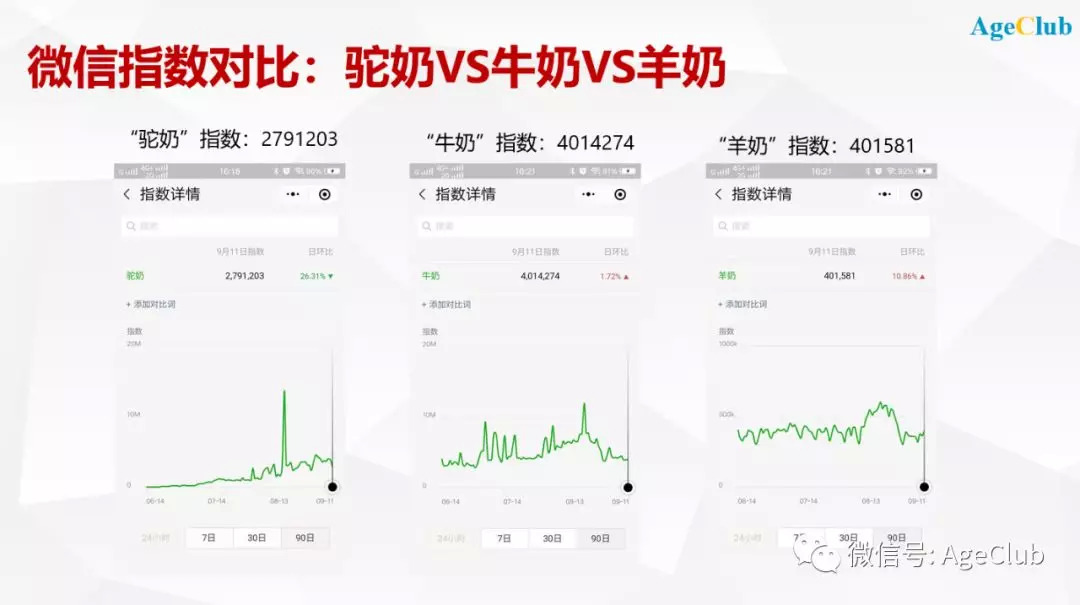最新的案例是最近两个月在微信上突然火起来的驼奶粉。从微信指数可以看到,关键词“驼奶”的热度是在进入7月后突然拉升起来的,而同期“牛奶”和“羊奶”都是在一个大致稳定的区间里上下波动。