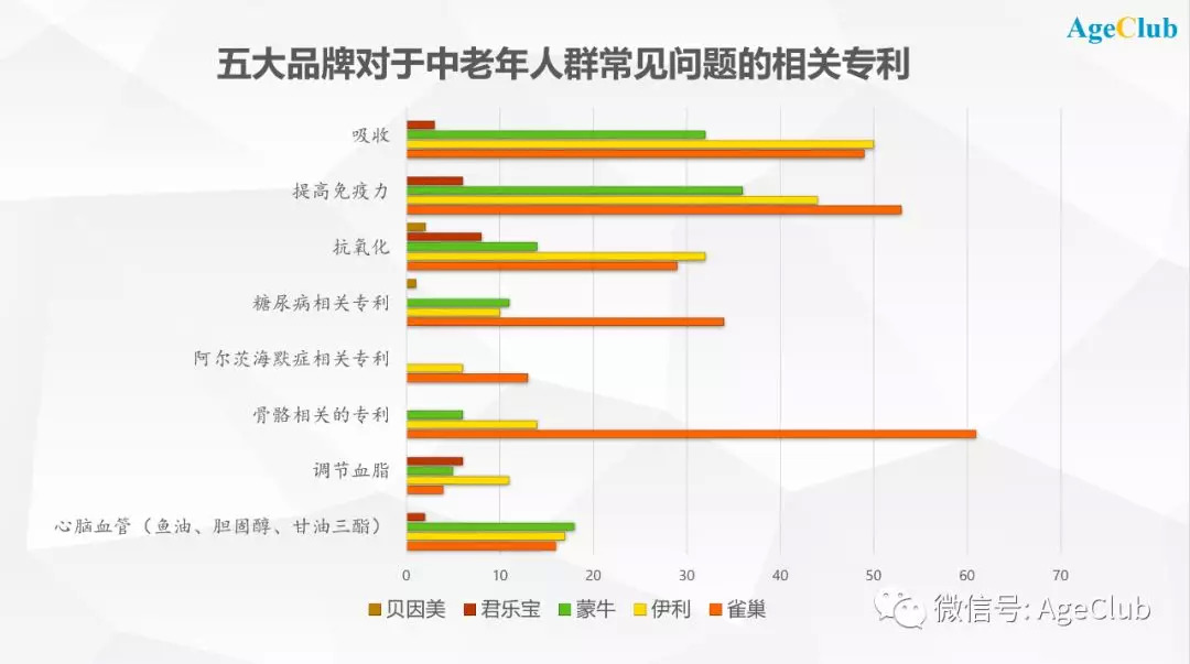 五大奶粉品牌在吸收、提高免疫力、抗氧化、骨骼、调节血脂、心脑血管方面的专利最多,未来在这几个细分方向的中老年奶粉可能竞争相对更激烈。