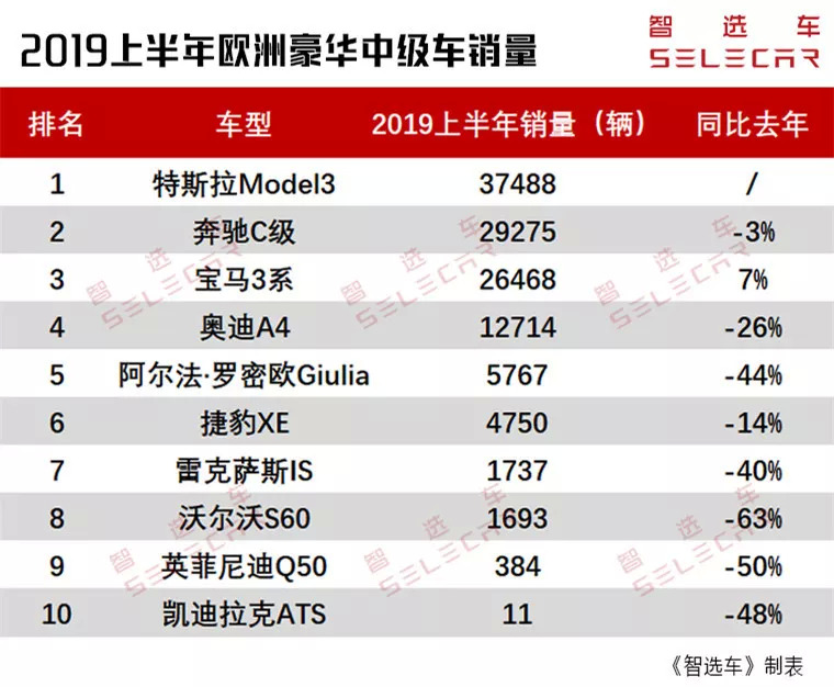 ①特斯拉Model3虽然不是欧洲车,但是销量夺得第一。这也说明欧洲人对于纯电动车有着一定接受度,并且对这款车认可度较高。另外从其它豪华中级车的同比跌幅来看,它们被Model3抢去了不少市场份额;