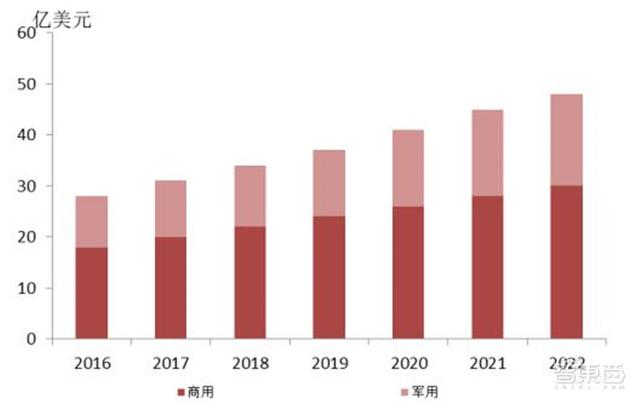 全球红外摄像机设备市场规模在2017年近30亿美元,其中商用摄像机市场规模20亿美元,军用摄像机市场规模10亿美元。预计2016-2022年商用领域红外摄像机市场规模年均复合增长率为5.6%,军用领域的年均复合增长率为8.8%。2022年市场总规模将近43亿美元 。