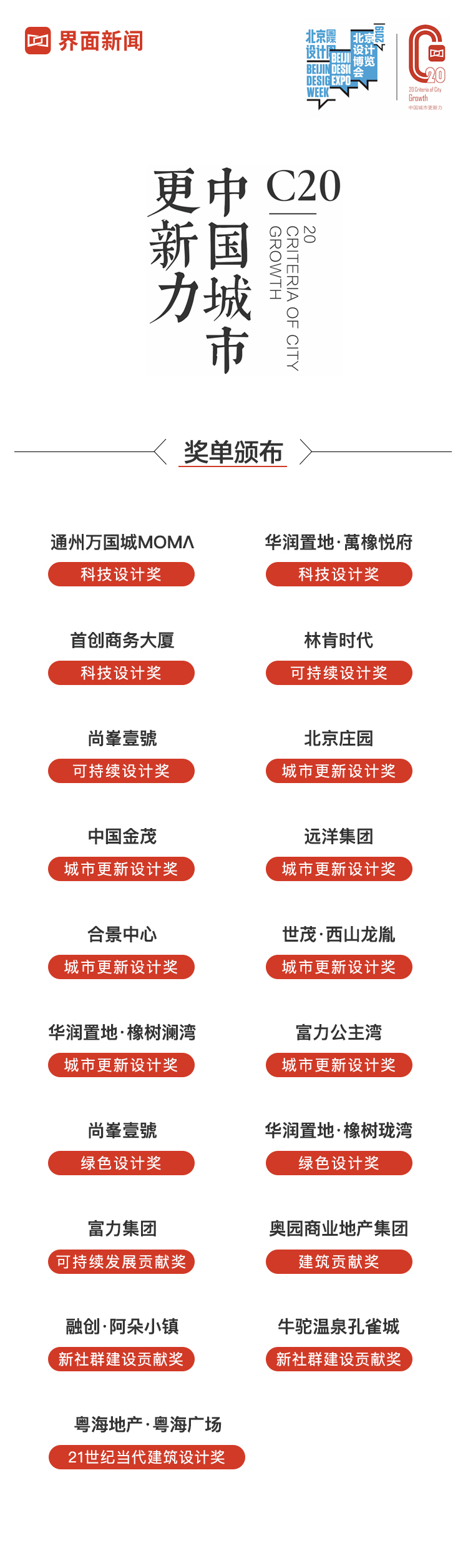 在本次设计周上,界面新闻、北京国际设计周博览会,以及2020年威尼斯双年展中国城市馆联合策划,参照联合国十七项可持续发展目标,推出C20中国城市更新力系列活动,举办“C20中国城市更新力核心主旨论坛”并发起城市更新领域的权威评奖,致力于发掘符合未来趋势的建筑设计和理念。