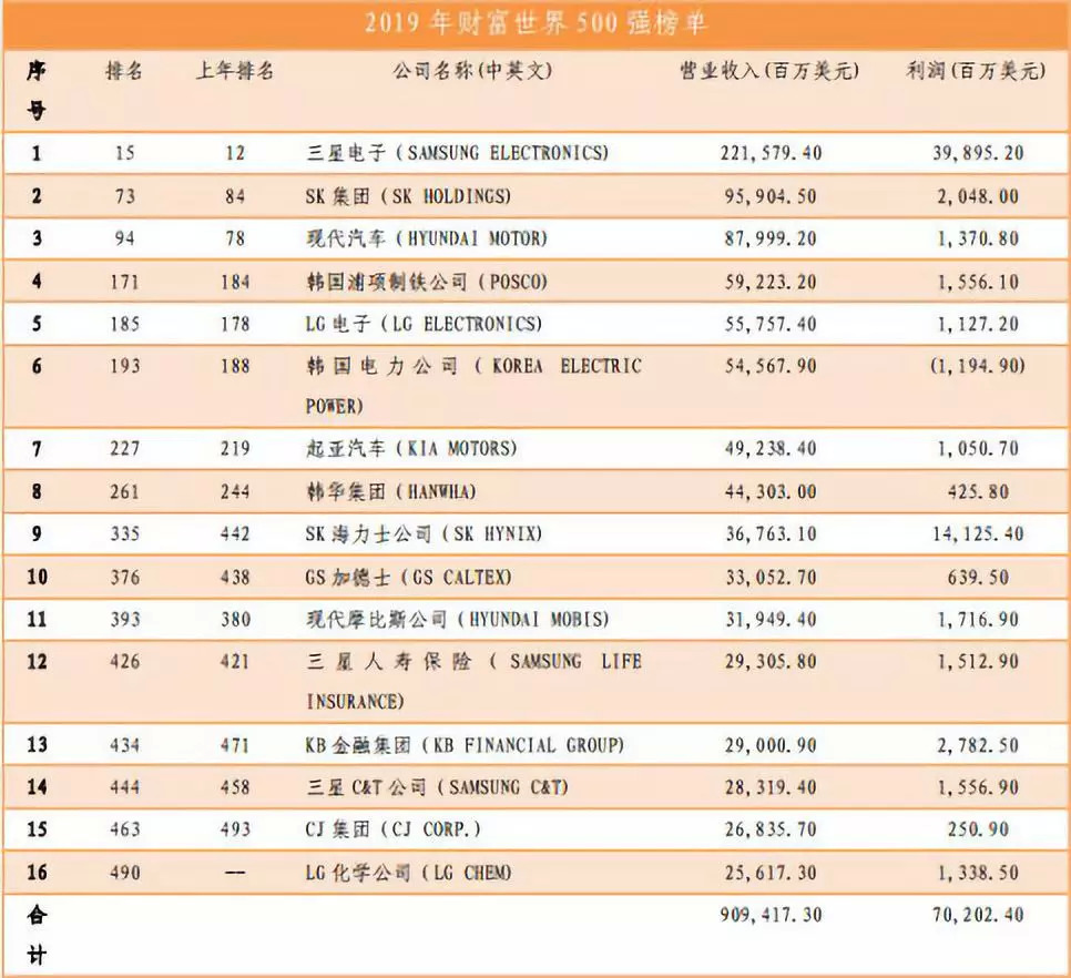 韩国财团经济实力不容小觑。2018年,韩国共有16家企业上榜财富世界500强。这16家企业无一例外都属于财团旗下,合计营业收入总计为909417.3百万美元,占到韩国GDP的60%。