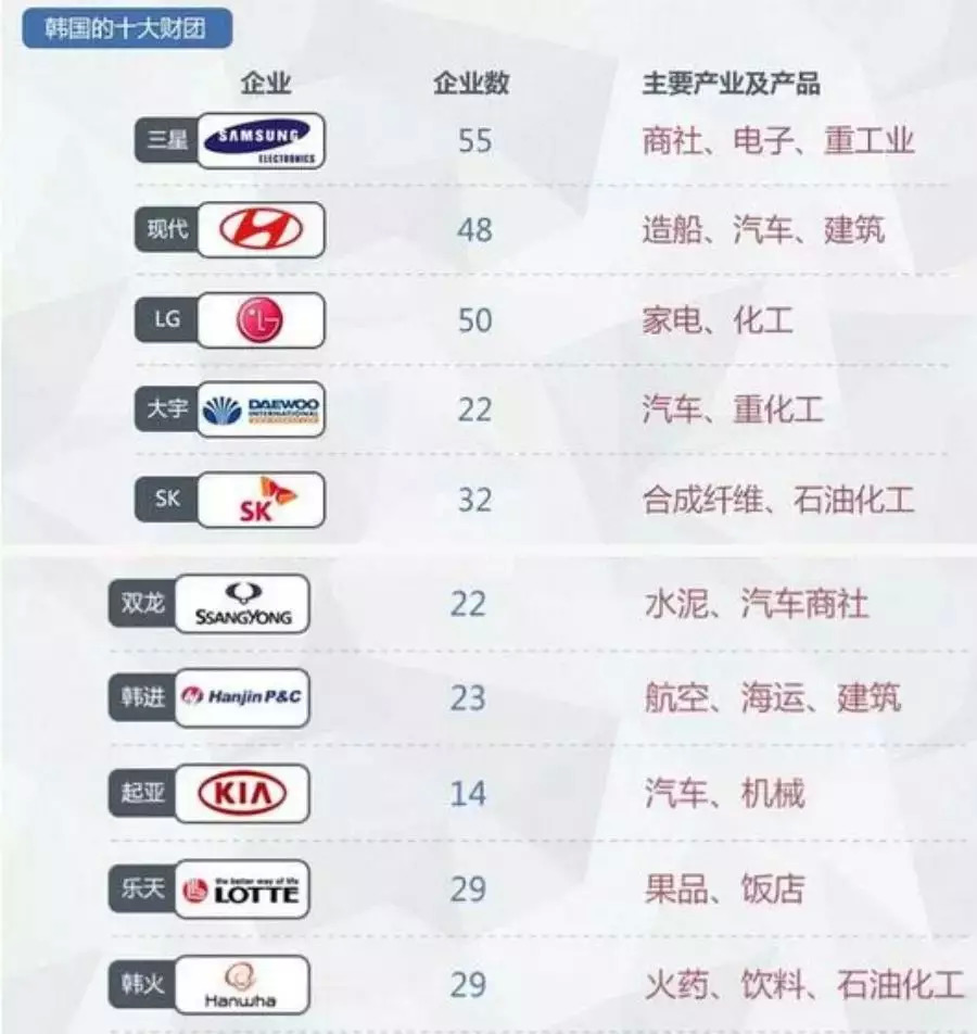 韩国的其他财团,还包括LG集团、SK集团、韩进集团、斗山集团、乐天集团、锦湖韩亚集团、浦项制铁公司、韩华集团等。