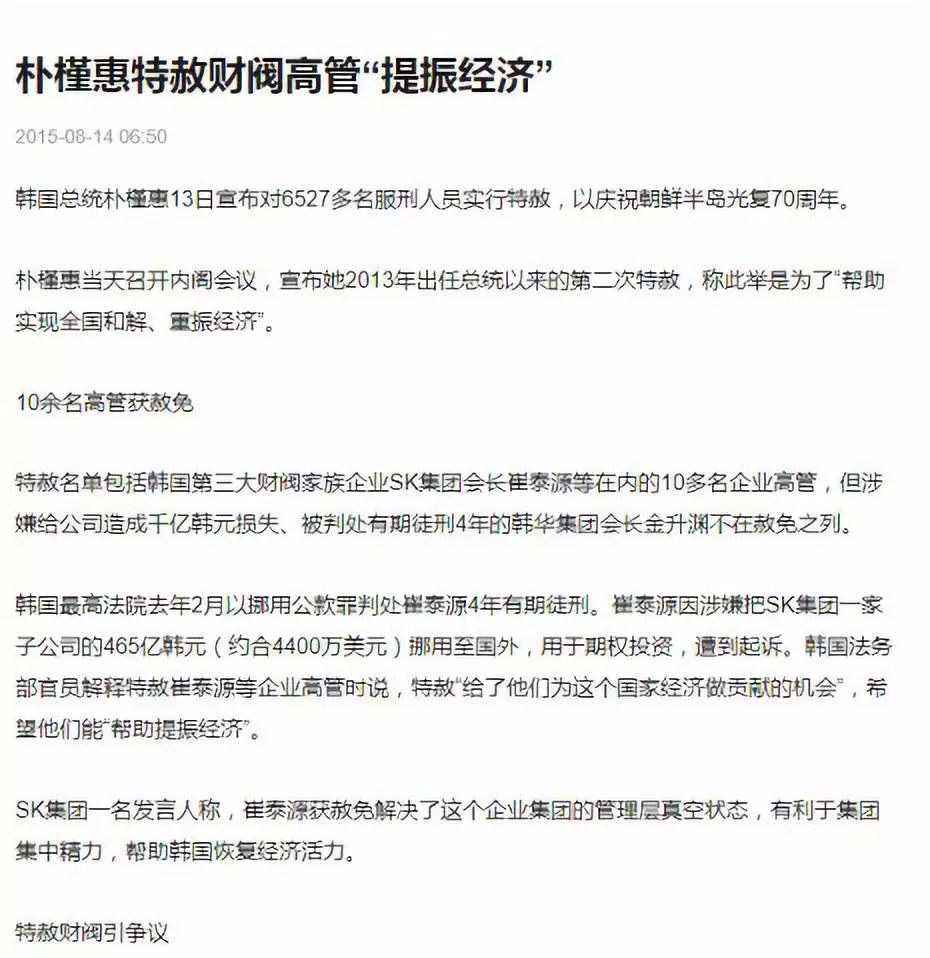 政府首脑自然也懂得投桃报李。历届韩国总统都会对部分先前违法入狱的财团“有功人士”施行特赦。2015年,时任韩国总统朴槿惠对包括SK集团会长崔泰源在内的10多名企业高管进行特赦,官方说法为:希望他们继续为国家经济做贡献。