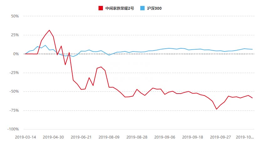 “中阅家族荣耀2号”采用主观多策略,产品成立初期,仅一个多月的时间里,净值已经快速攀升至1.315。不过,好景不长,自4月26日之后,该产品的净值却开始一路波动向下,至9月26日,累计亏损率一度高达73.5%,近期虽有所回升,但截至10月10日公布的最新净值也仅为0.43,跑输同期沪深300指数60余个百分点。