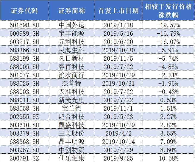 其实,渝农商行并非孤例,界面新闻梳理发现,今年上市的新股中,目前已经有9只个股截至11月11日的最新收盘价跌破了发行价,另外还有7只股票的最新收盘价相较于其发行价的涨幅在10%以内,已经是破发在即。