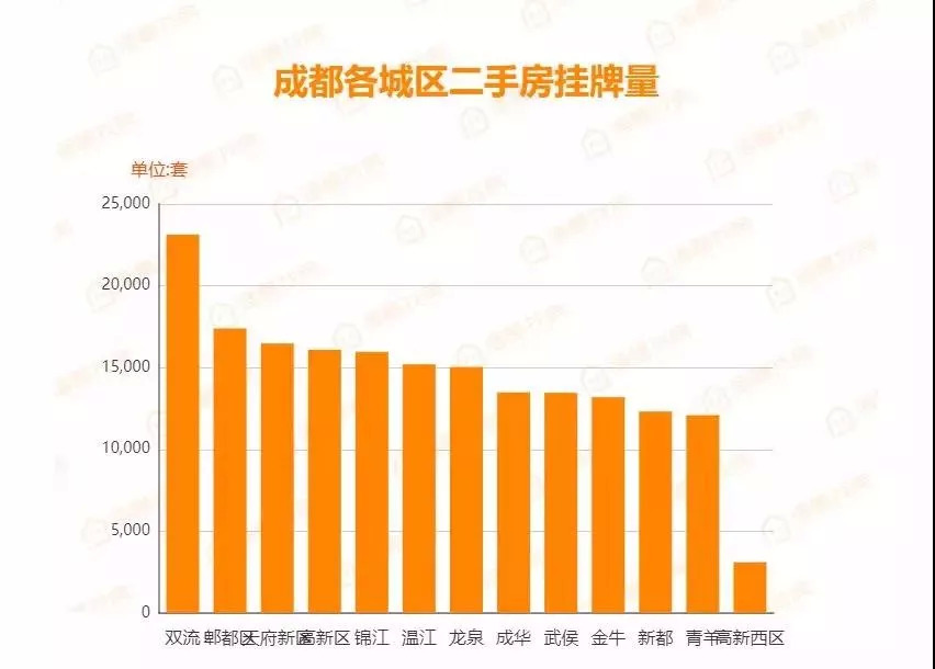 在售房源方面,双流区仍然稳居第一,郫都区位于第二,天府新区市场房源量超过高新区上位第三名。