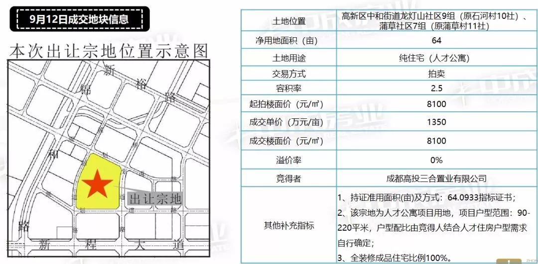 土地成交方面,上周(2019.09.09--2019.09.15)成都公共资源交易中心公开拍卖1宗涉宅用地,该地块位于高新南区新川板块,为人才公寓供地,净用地面积约64.09亩,地块由成都高投三合置业有限公司底价竞得,成交楼面地价8100元/㎡。
