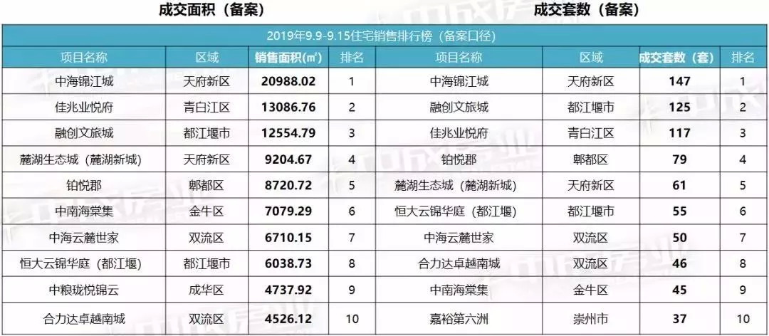 △ 2019.09.09--2019.09.15住宅销售排行榜,数据源自成都中成房业