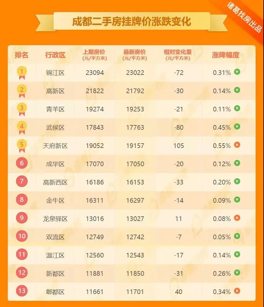 在涨降价幅度方面,武侯区市场价为17763元/㎡,跌幅最高,达0.45%;天府新区的市场价为19157元/㎡,涨幅最高,为0.55%,其次为环比上升0.34%的郫都区,均价为11701元/㎡。