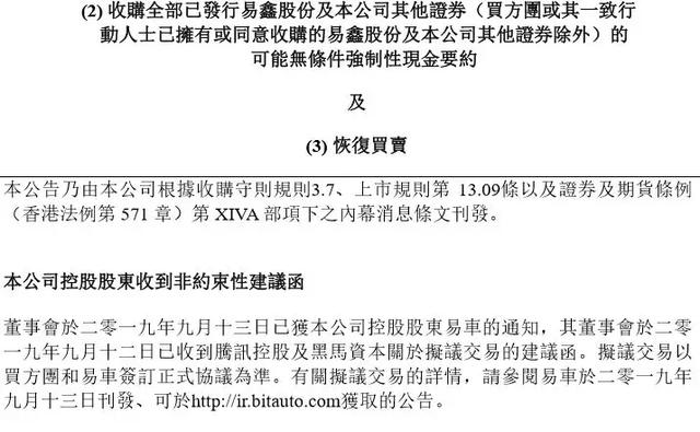 9月13日,易鑫集团发布公告称,董事会收到公司控股股东易车的通知,易车董事会在9月12日收到腾讯控股及黑马资本(下称“买方团”)关于拟议交易的建议函。