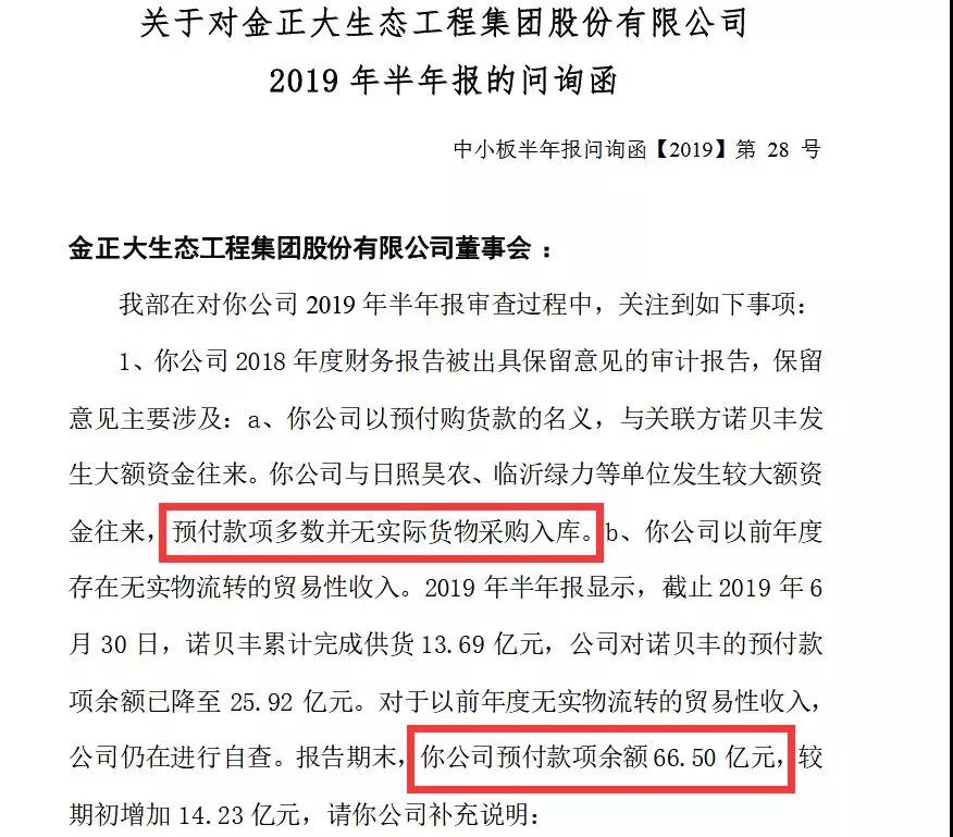 对此,深交所要求金正大列表披露报告期末前五名预付款项的明细,在收到诺贝丰、日照昊农等单位货物后,报告期末预付款项仍大幅增加的原因及合理性,以及报告期末预付款项余额是否存在关联方款项、相关采购不采用现付的原因是否具有商业实质,是否和公司对原材料的实际需求相匹配。