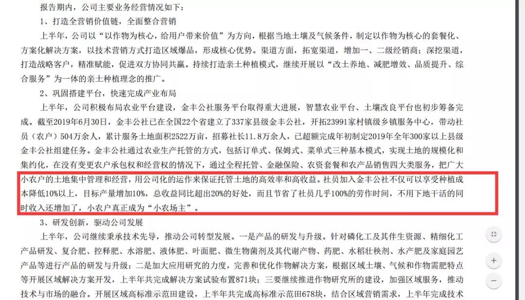 金正大还在半年报中提到,截至2019年6月30日,金丰公社已在全国22个省建立了337家县级金丰公社,开拓2.40亿家村镇级乡镇服务中心,带动社员(农户)504万余人,累计服务土地面积2522万亩,招募社长11.8万余人。