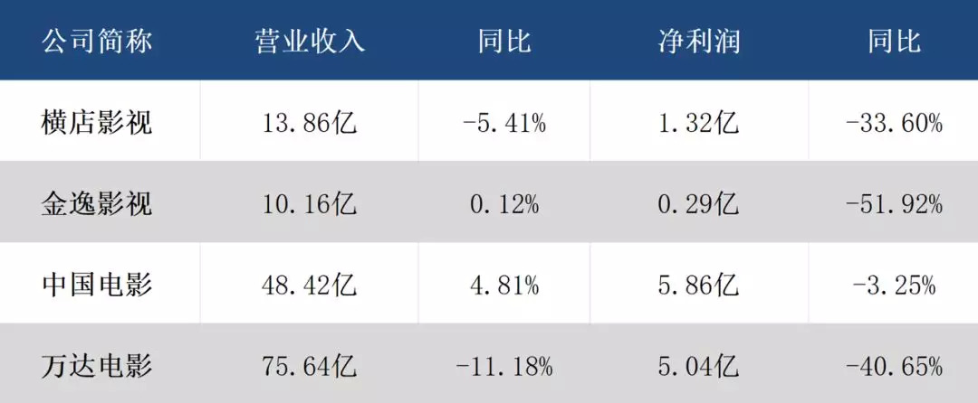 从万达电影、中国电影、金逸影视、横店影视四家拥有大型院线的A股上市公司来看也很明显,营收增长基本陷于停滞甚至下滑,净利润更是普遍同比大幅下降: