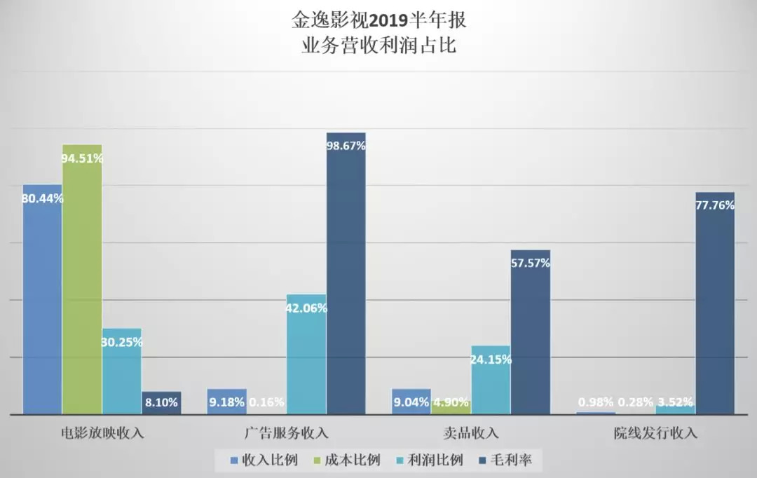 因为万达电影并购的万达影视未能取得较好成绩,万达电影上半年电影制作发行及相关业务收入仅有2.38亿元,同比降幅为70.14%,仅占同期总收入3%左右,导致万达2019年上半年财报再度成为“标准”的院线公司模式。从数据统计可以看出,万达电影和金逸影视虽然影院模式不同,但营收业务占比特点基本一致: