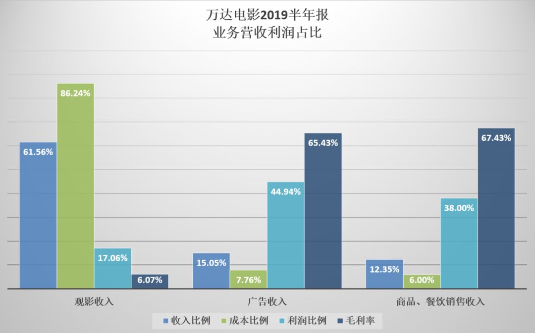 以金逸影视为例,来源于放映的收入占总收入比例高达80.44%,成本占比达到94.51%,毛利率仅8.1%,贡献利润约30%;而广告业务和卖品业务相加营收不过2成,却创造了近7成的利润。万达电影的数据更甚,广告和商品、餐饮销售所占利润分别达到44.94%和38%。