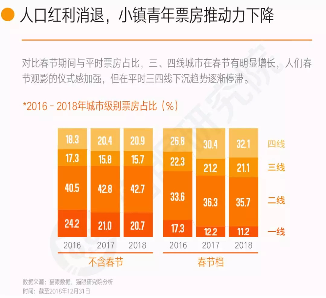 一是,院线市场依赖于整体市场,受制于上游内容制作的水准,一旦市场低迷,院线因为重资产特性承压会更大;二是影院的“下沉”逻辑同样是未知数。据猫眼研究院数据显示,不含春节档统计中,三四线城市票房占比基本停滞,“下沉”说法显然不算靠谱。