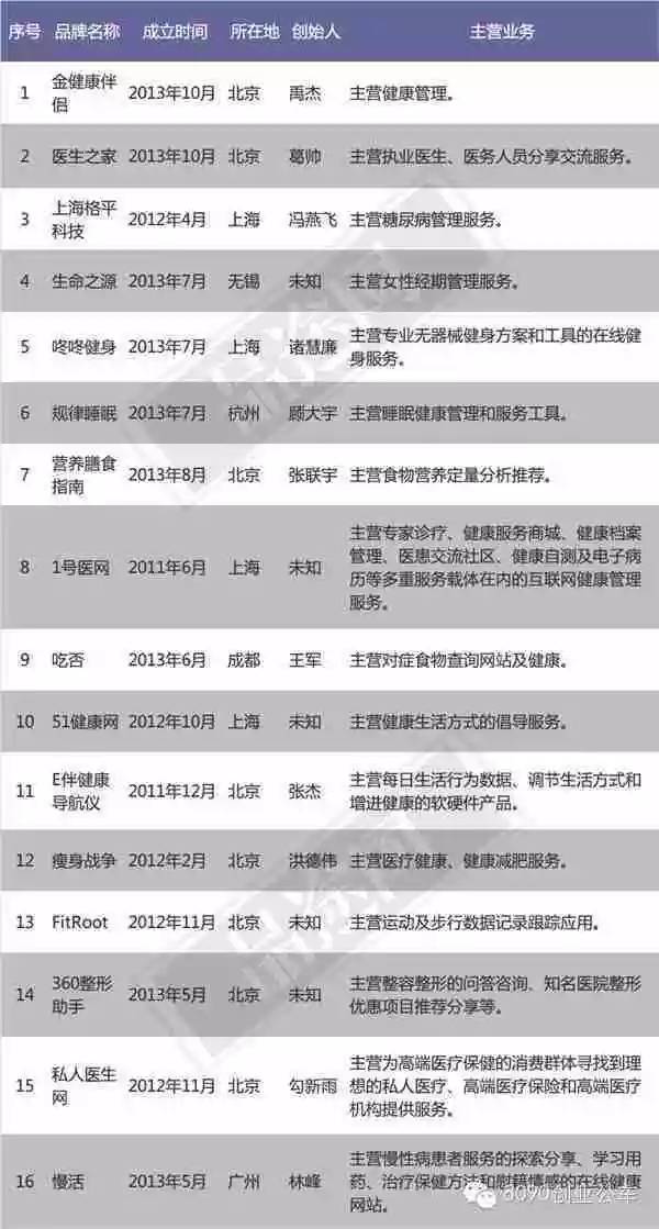 2. 通过列表可以看出,死亡企业多以健康管理为主,从事该领域的企业较多,不利于形成竞争优势,一旦没有巨头注资,很容易被行业淘汰。
